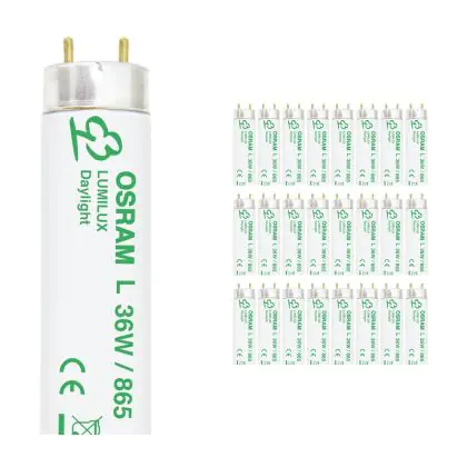 I Confezione Multipack 25x Osram T8 Lumilux 36W - 865 Luce del Giorno | 120cm sono i tubi più comuni e tra le lampade più vendute nel mondo. Questi tubi T8 (TL-D per Philips) hanno una lunghezza la quale corrisponde alla potenza di 36W.