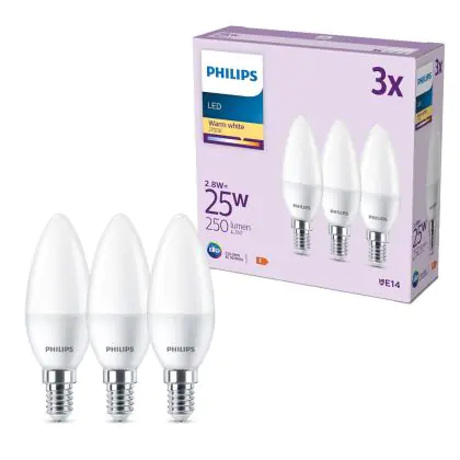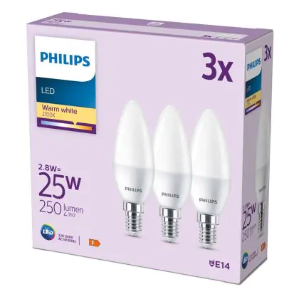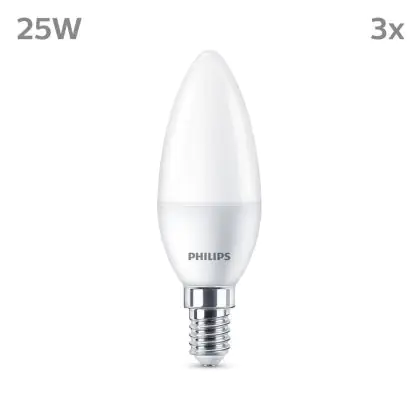 Nome del fabbricante | Box 3 stuks - Philips LED Kaarslamp Mat - 25 W - E14 - Warmwit licht | |