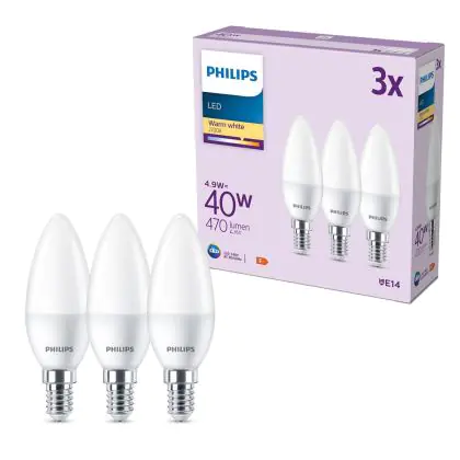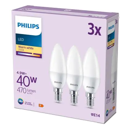 Nome del fabbricante | Box 3 stuks - Philips LED Kaarslamp Mat - 40 W - E14 - Warmwit licht | |