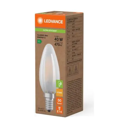 La lampada Ledvance LED Classic E14 Candela Filamento Ghiaccio 2.2W 470lm - 827 Bianco Molto Caldo | Sostitutiva 40W è il sostituto perfetto per le tue vecchie lampade 40W con attacco a vite piccolo E14 grazie alla sua tecnologia LED. Passare a LED ti offrirà molti vantaggi!