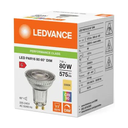 Puoi risparmiare fino al 90% tra il risparmio di energia e I costi di mantenimento grazie al basso consume di soli 7W e la lunga vita media utile di 25000 ore, comparandola invece con una lampada alogena GU10 con la sola durata di 2.000 ore. Inoltre le lampade LED non producono raggi IR e raggi UV dannosi per noi esseri umani tutto questo senza neanche produrre calore! Installarla è veramente semplice: ruotare la vecchia lampada GU10 di un quarto e rimuoverla dall’attacco. Successivamente inserire la lampada LED GU10 nell’attacco e girarla di un quarto per installarla. Questa è lampada di alta qualità Ledvance e parte da un prezzo di . Puoi usare questo prodotto come desideri grazie alla nostra garanzia totale di3 anni da Lampadadiretta.it.