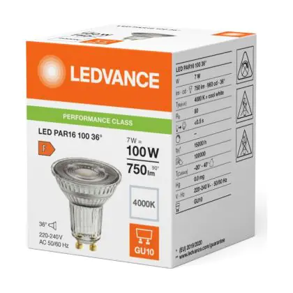 La Ledvance LED PAR16 GU10 Riflettore 7W 750lm 36D - 840 Bianco Freddo | Sostitutiva 80W è perfetta per la sostituzione della convenzionale Lampada alogena 80W GU10 con colore della luce 840 Bianco Freddo. Questa Lampada ha una forma Riflettore con un diametro di 50mm. I due perni sono distanti tra loro 10mm. Questa lampada funziona con la 220V-230V e quindi non ha bisogno di trasformatori. Passare a LED ti offrirà molti vantaggi!