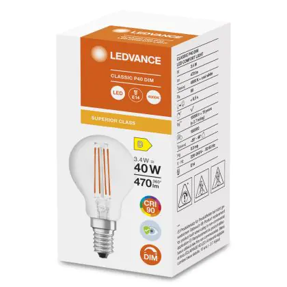 La lampada Ledvance Superior Classic LED E14 Sferica Filamento Chiara 3.4W 470lm - 940 Bianco Freddo | Dimmerabile - Miglior resa cromatica è il sostituto perfetto per le tue vecchie lampade 40W con attacco a vite piccolo E14 grazie alla sua tecnologia LED. Passare a LED ti offrirà molti vantaggi!