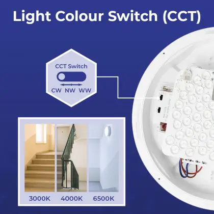 Per scegliere un apparecchio di illuminazione bisogna anche considerare dove verrà installato. Per esempio la luce di 2700 Kelvin (bianco molto caldo) e 3000 Kelvin (bianco caldo) creano un’atmosfera rilassante e piacevole. Questa tonalità è quindi molto adatta ad ambienti accoglienti o a zone generiche come corridoi, ascensori, disimpegni o pianerottoli. Una luce di 4000 Kelvin (bianco freddo), invece,è più luminosa e fresca ed è quindi adatta come illuminazione funzionale in uffici, aziende, scuole e biblioteche. La temperatura di colore di questa plafoniera LED è 3000K - 4000K - 6000K CCT.