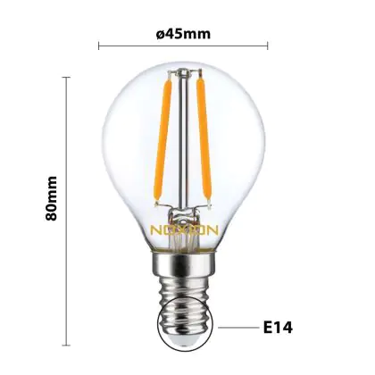 La lampada Noxion Lucent LED E14 Sferica Filamento Chiara 2.5W 250lm - 827 Bianco Molto Caldo | Sostitutiva 25W è il sostituto perfetto per le tue vecchie lampade 25W con attacco a vite piccolo E14 grazie alla sua tecnologia LED. Passare a LED ti offrirà molti vantaggi!