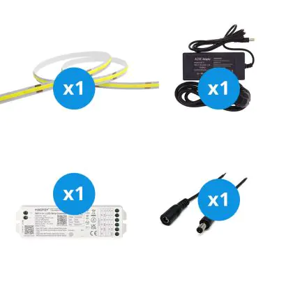 Il grande vantaggio di questo kit completo è che include tutti gli accessori necessari per installare il nastro LED a casa o in azienda. Vi forniamo il materiale necessario per installare il nastro LED. Poi si collega il tutto a una presa elettrica standard. Troverete tutte le informazioni necessarie nel nostro blog sull'installazione. Il kit comprende: