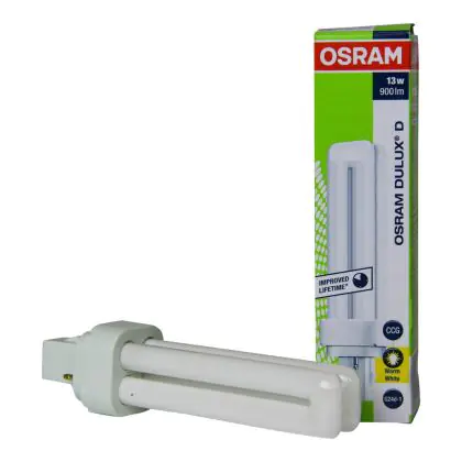 Questa lampada fluorescente compatta Dulux D OSRAM presenta l’attacco a innesto G24d-1 con due spinotti. Grazie alla tecnologia a fluorescenza, è un’ottima soluzione per un’illuminazione affidabile con un consumo energetico di 13W. È adatta per un’installazione negli apparecchi luminosi dotati di alimentatore convenzionale.