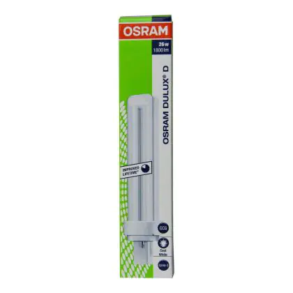 Questa lampada fluorescente compatta Dulux D OSRAM presenta l’attacco a innesto G24d-3 con due spinotti. Grazie alla tecnologia a fluorescenza, è un’ottima soluzione per un’illuminazione affidabile con un consumo energetico di 26W. È adatta per un’installazione negli apparecchi luminosi dotati di alimentatore convenzionale.