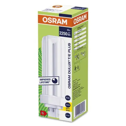 Le Osram DULUX T/E 32W/830 PLUS Lumilux Warm White sono lampade fluorescenti compatte dall'alta efficienza luminosa che presentano una potenza pari a 32W. Le stesse sono poi dotate di attacco a 4 pin (perni). I vantaggi di tali lampade sono diversi: oltre alla lunga vita di 13.000 ore é importante ricordare l'eccellente flusso luminoso di 2400 lumen.