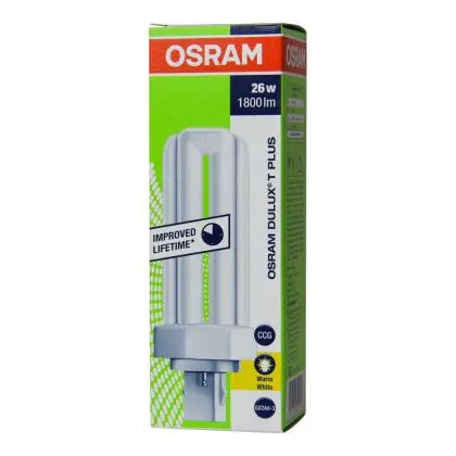 Le Osram Dulux T 26W/830 PLUS Lumilux Warm White sono lampade fluorescenti compatte che presentano una potenza pari a 26W. Le stesse sono poi dotate di attacco a 2 pin (perni). I vantaggi di tali lampade sono diversi: oltre alla lunga vita pari a 8000 ore é importante ricordare l'alto flusso luminoso di 1800 lumen.