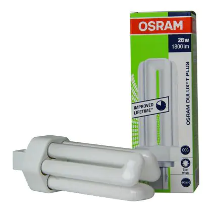 Le Osram Dulux T 26W/840 PLUS Lumilux Cool White sono lampade a basso consumo caratterizzate da una vita media lunga e che emettono una luce di buona qualità. La base di queste lampade fluorescenti compatte é del tipo a 2 pin (perni). La potenza delle medesime é pari a 26W.