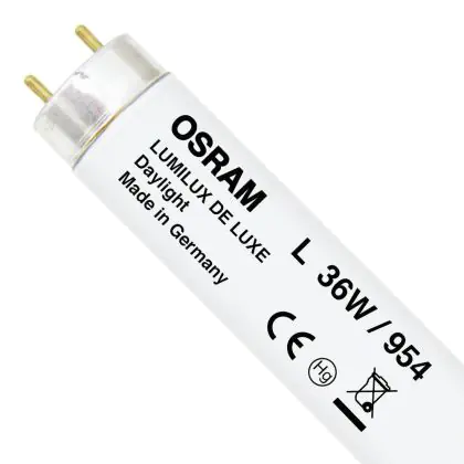 I Osram Lumilux De Luxe T8 36W - 954 Bianco Freddo | 97cm sono i tubi più comuni e tra le lampade più vendute nel mondo. Questi tubi T8 (TL-D per Philips) hanno una lunghezza la quale corrisponde alla potenza di 36W.