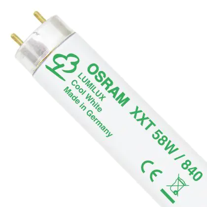 Gli Osram T8 L 58W/840 XXT G13 Cool White sono tubi fluorescenti caratterizzati da una potenza di 58W e provvisti di attacco G13 che rientrano nella classe energetica 'A'. Questi tubi misurano 150cm. La vita dei medesimi é in media di 80.000 ore e questo é un elemento tipico della linea Osram Lumilux XXT. Un accenno all'indice di resa cromatica che si pone nell'intervallo di 80-89Ra. I tubi fluorescenti in questione profondono una luce bianca fredda (temperatura di colore 4000K).
