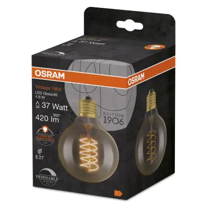 La Osram Vintage 1906 LED E27 Globe Filament Gold 80mm 4.8W 420lm - 822 Extra Warm White | Dimmable è la perfetta sostituzione per la tua lampada convenzionale 37W con attacco E27 grazie alla sua tecnologia LED. Passare a LED ti offrirà tanti vantaggi!