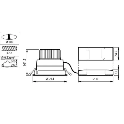 Descrizione Philips Downlight LED LuxSpace Compatto Altezza ridotta DN570B 52.8W 6200lm 80D - 830 Luce Calda | 214mm - Aluminium Riflettore