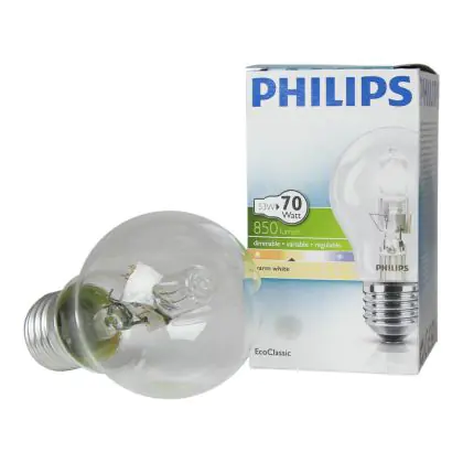 La Philips EcoClassic 53W E27 230V A55 CL é una lampadina alogena dalla tipica forma sferica e dotata di un vetro trasparente. La base E27 permette di utilizzare questa lmapadina in applicazioni domestiche ma anche professionali. La vita utile di questo modello é di 2.000 ore, decisamente più lunga rispetto alle normali lampadine alogene! La luce profusa dalla Philips EcoClassic 53W E27 230V A55 CL é di colore bianco caldo, 2800K, e di ottima qualità; la possibilità di regolare l'intensità luminosa permette di modificare l'atmosfera nel vostro ambiente a seconda delle esigenze.
