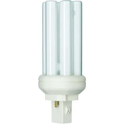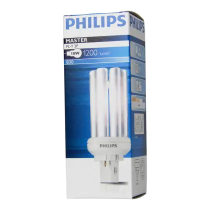 Le Philips PL-T 18W 840 2P (MASTER) sono efficienti lampade fluorescenti compatte a basso contenuto di mercurio. Sono molto efficienti e garantiscono performance ottimali di illuminazione per periodi di accensione brevi o lunghi. Tali lampade fluorescenti compatte sono dotate di attacco GX24d-2 e la base presenta 2 pin (perni). La potenza delle stesse é pari a 18W. Quando sostituisci le tue lampade fluorescenti compatte é fondamentale scegliere le nuove con il medesimo attacco, numero di pin (perni) e potenza di quelle che stai attualmente usando altrimenti non sarai in grado di installarle. Queste lampade fluorescenti compatte profondono una luce bianca fredda grazie alla temperatura di colore di 4000K. L'indice di resa cromatica é davvero buono in quanto si colloca nell'intervallo di 80-89Ra. Queste lampade a basso consumo si contraddistinguono per una lunga vita di 13.000 ore.