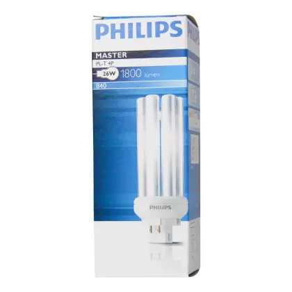Le Philips PL-T 26W 830 4P (MASTER) sono efficienti lampade fluorescenti compatte a basso contenuto di mercurio. Sono molto efficienti e garantiscono performance ottimali di illuminazione per periodi di accensione brevi o lunghi. Tali lampade fluorescenti compatte sono dotate di attacco GX24q-3 e la base presenta 4 pin (perni). La potenza delle stesse é pari a 26W. Quando sostituisci le tue lampade fluorescenti compatte é fondamentale scegliere le nuove con il medesimo attacco, numero di pin (perni) e potenza di quelle che stai attualmente usando altrimenti non sarai in grado di installarle. Grazie alla temperatura di colore di 3000K, tali lampade fluorescenti compatte emettono una luce bianca calda: é la temperatura di colore ideale se si vuole ottenere un'atmosfera invitante ed attiva al tempo stesso. Importante sottolineare l'indice di resa cromatica superiore a 80Ra: questo indica che le caratteristiche degli oggetti illuminati vengono poste in risalto in maniera ottimale. La vita media delle stesse é di 13.000 ore.