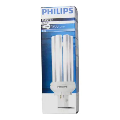 Le Philips PL-T 26W 840 2P (MASTER) sono lampade fluorescenti compatte veramente efficienti dal punto di vista energetico in quanto consumano poca energia e sono caratterizzate da una vita media incredibilmente lunga. La base di queste lampade fluorescenti a basso consumo é del tipo GX24d-3 a 2 pin (perni). La potenza delle medesime é pari a 26W. Quando decidi di sostituire le tue vecchie lampade fluorescenti compatte, é di estrema importanza mantenere medesima base, numero di pin (perni) e stessa potenza: se anche uno solo di questi parametri é differente dalle tue lampade originali, con tutta probabilità non riuscirai a procedere con l'installazione. La temperatura di colore di queste lampade é di 4000K, il che corrisponde ad una luce bianca fredda. L'indice di resa cromatica si pone nell'intervallo di 80-89Ra. Queste lampade sono in classe efficienza energetica 'B' . La vita media é lunga, 13.000 ore in media.