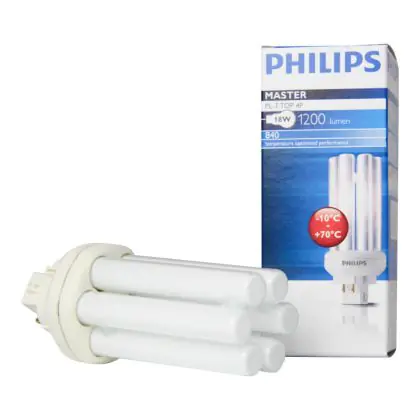 Le Philips PL-T TOP 18W 840 4P (MASTER) sono lampade fluorescenti compatte a basso contenuto di mercurio davvero efficienti. Queste lampade fluorescenti a basso consumo sono un'ottima scelta in termini di rispetto dell'ambiente anche perché hanno una lunga vita. Esse inoltre assicurano performance ottimali di illuminazione per periodi di funzionamento lunghi. L'attacco di queste lampade é del tipo GX24q-2 ed é dotato di 4 pin (perni). La potenza di tali lampade é di 18W. Ricorda: quando sostituisci le tue lampade fluorescenti compatte devi mantenere il medesimo attacco, numero di pin (perni) e potenza delle tue vecchie lampade, altrimenti non sarai in grado di procedere con l'installazione. Questa lampade presentano una temperatura di colore di 4000K, che corrisponde ad una luce bianca fredda. L'indice di resa cromatica é superiore a 80Ra. Le Philips PL-T TOP 18W 840 4P (MASTER)sono classificate con etichetta energetica 'B'. La loro durata media é molto lunga, in media 13000 ore.