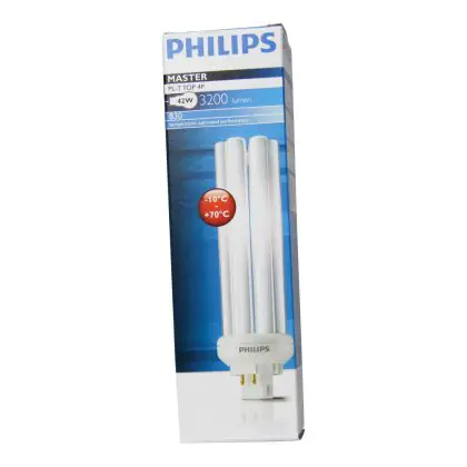 Le Philips PL-T TOP 42W 830 4P (MASTER) sono efficienti lampade fluorescenti compatte a basso contenuto di mercurio. Sono molto efficienti e garantiscono performance ottimali di illuminazione per periodi di accensione lunghi. Tali lampade fluorescenti compatte sono dotate di attacco GX24q-4 e la base presenta 4 pin (perni). La potenza delle stesse é pari a 42W. Quando sostituisci le tue lampade fluorescenti compatte é fondamentale scegliere le nuove con il medesimo attacco, numero di pin (perni) e potenza di quelle che stai attualmente usando altrimenti non sarai in grado di installarle.