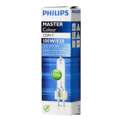 Le Philips CDM-T Elite 100W 930 G12 (MASTERColour) sono lampade a scarica compatte con una potenza di 100W e dotate di attacco G12. Tali lampade a scarica emettono per tutta la loro vita, pari a 15000 ore, una luce brillante di una qualità superiore rispetto alle normali Philips CDM-T grazie al più elevato indice di resa cromatica di 90-100Ra. La qualità dell'illuminazione rimane altresí stabile e costante lungo il medesimo periodo che ricordiamo essere più lungo delle classiche Philips CDM-TC. Questo prodotto presenta una intensità del flusso luminoso notevole con un livello di lumen. Queste lampade presentano un filtro UV che permette di limitare fortemente lo scolorimento degli oggetti illuminati.