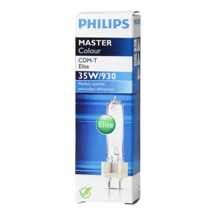 Le Philips CDM-T Elite 35W 930 G12 (MASTERColour) sono lampade a scarica compatte da 35W con base G12. Queste lampade a scarica presentano una vita media di 15.000 ore, più lunga delle normali Philips CDM-T e sono caratterizzate da un'elevata efficienza energetica. La resa dei colori é eccezionale grazie all'indice di resa cromatica di 90-100Ra: questo sta ad indicare che le caratteristiche degli oggetti illuminate sono poste in risalto in maniera ottimale. Sono inoltre dotate di un filtro UV che limita di molto lo scolorimento degli oggetti illuminati. Un'altra proprietà da sottolineare é l'intensità del flusso luminoso: ben 4000 lumen!