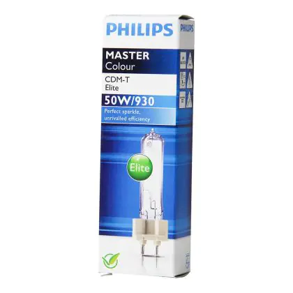Le Philips CDM-T Elite 50W 942 G12 (MASTERColour) sono lampade a scarica compatte da 50W con base G12. Queste lampade a scarica presentano una vita media di 15.000 ore, più lunga delle normali Philips CDM-T e sono caratterizzate da un'elevata efficienza energetica. La resa dei colori é eccezionale grazie all'indice di resa cromatica di 90-100Ra: questo sta ad indicare che le caratteristiche degli oggetti illuminate sono poste in risalto in maniera ottimale. Sono inoltre dotate di un filtro UV che limita di molto lo scolorimento degli oggetti illuminati. Un'altra proprietà da sottolineare é l'intensità del flusso luminoso: ben 4750 lumen!