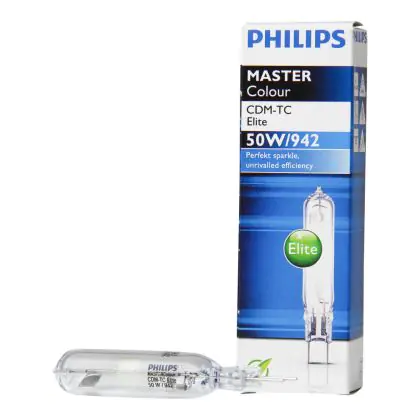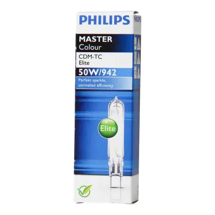 Le Philips CDM-TC Elite 50W 942 G8.5 (MASTERColour) sono lampade a scarica compatte ad alogenuri metallici da 50W con base G8.5. Queste lampade a scarica ad alogenuri metallici presentano una vita media di 15.000 ore, più lunga delle normali Philips CDM-TC e sono caratterizzate da un'elevata efficienza energetica. La resa dei colori é eccezionale grazie all'indice di resa cromatica di 90-100Ra: questo sta ad indicare che le caratteristiche degli oggetti illuminate sono poste in risalto in maniera ottimale. Sono inoltre dotate di un filtro UV che limita di molto lo scolorimento degli oggetti illuminati. Un'altra proprietà da sottolineare é l'intensità del flusso luminoso: ben 7400 lumen!