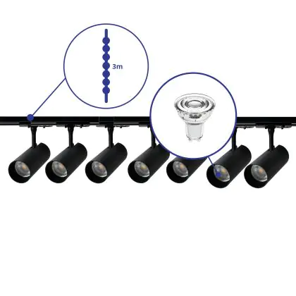 Descrizione Set completo 1-Fase Rail 3 Metro Nero | incl. 7x Faretti + GU10 2700K 3W Dimmerabile + Tappo Di Chiusura, Connettore di Alimentazione e I-Connettore